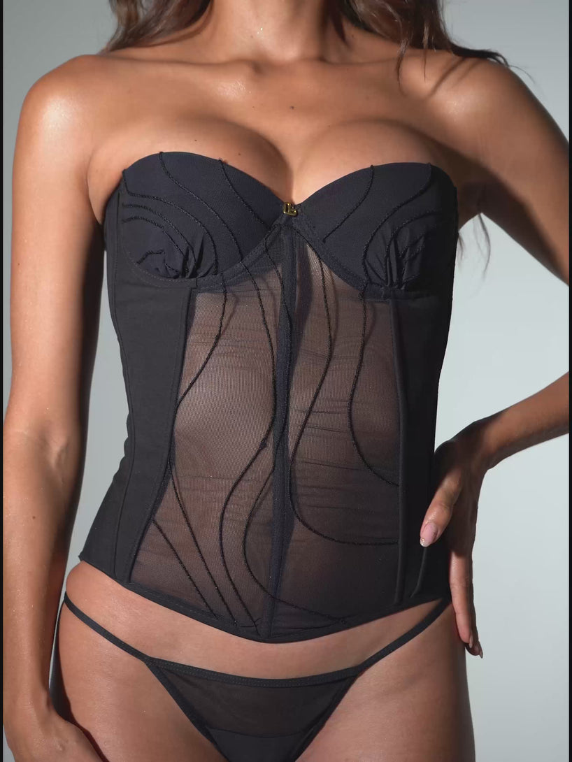 Corsé con detalles bordados artesanales en ondas y transparencias en la parte frontal que elevan su diseño. Su parte posterior presenta un ajuste tipo corse con cintas, permitiendo un entalle preciso, cómodo y favorecedor.